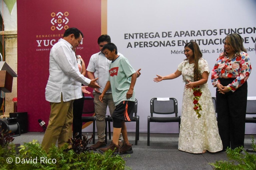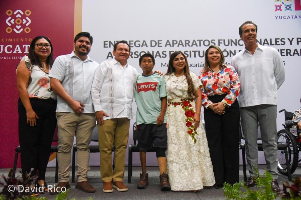 El gobernador Joaquín Díaz Mena y la presidenta honoraria del DIF Yucatán, Wendy Méndez Naal, encabezaron la entrega de sillas de ruedas, órtesis y prótesis.