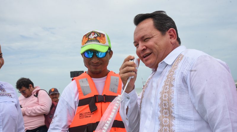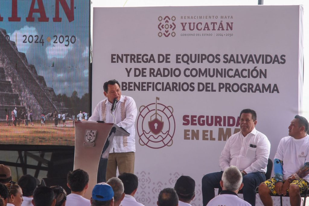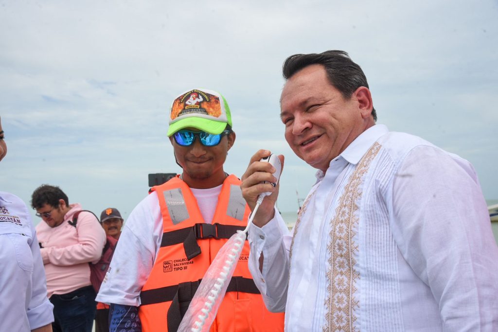 El gobernador Joaquín Díaz Mena encabezó desde Celestún la entrega de apoyos del Programa Seguridad en el Mar, mediante el cual las y los pescadores de todo el litoral yucateco recibirán 3 mil 500 radios VHF con botón de pánico y chalecos salvavidas.
