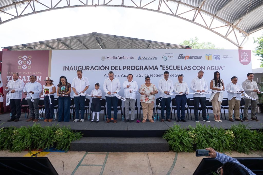 Acanceh, Yucatán, a 25 de septiembre de 2025.- Como parte de la alianza entre el Gobierno del Estado, la Fundación Coca-Cola México y Bepensa, se inauguró en la primaria Primitivo Rubio Ávila el programa Escuelas con Agua, que dotará a 34 planteles de 26 municipios con sistemas de captación de lluvia, garantizando agua limpia para más de seis mil estudiantes en Yucatán.