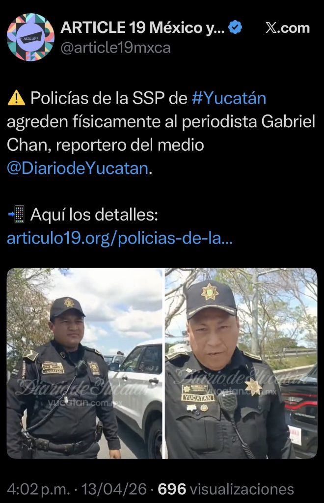 Mérida, Yucatán, a 13 de abril de 2026.- La organización Article 19 exigió a la Secretaría de Seguridad Pública de Yucatán (SSP) a capacitar a sus elementos en materia de libertad de expresión y fortalecer protocolos que garanticen el ejercicio periodístico, así como adoptar medidas institucionales para erradicar prácticas que limiten o vulneren el trabajo de la prensa en la entidad.