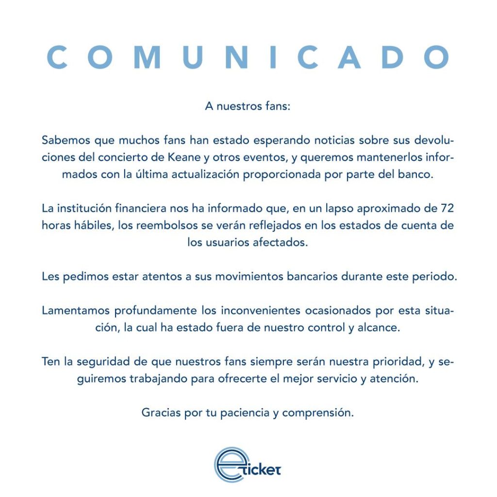 En el comunicado que se colocó en su página de Facebook la empresa señala que “sabemos que muchos fans han estado esperando noticias sobre sus devoluciones del concierto de Keane y otros eventos, y queremos mantenerlos informados con la última actualización proporcionada por parte del banco”.