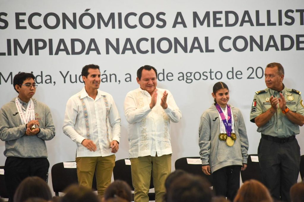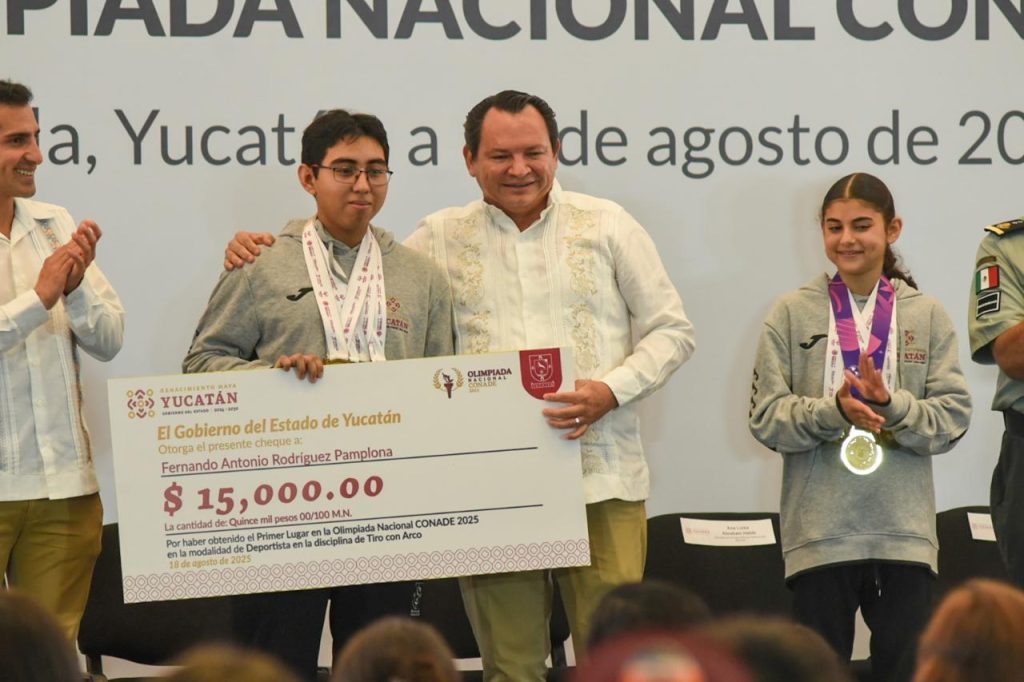 Mérida, Yucatán, 18 de agosto 2025.- El gobernador Joaquín Díaz Mena entregó estímulos económicos a 278 atletas y 91 entrenadores medallistas de la Olimpiada Nacional Conade 2025, resultado que colocó a Yucatán en el sexto lugar del medallero nacional.