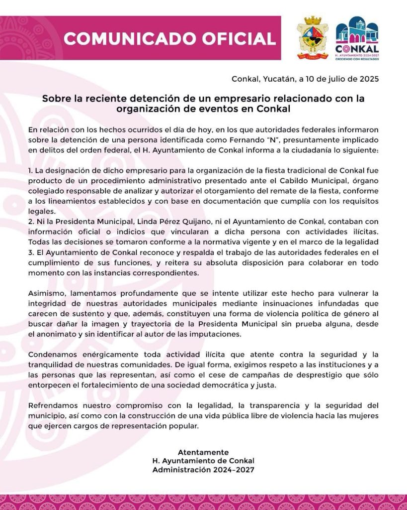 Mérida, Yucatán, 10 julio de 2025.- A través de un comunicado, el Ayuntamiento de Conkal reconoció que contrató a Fernando “N” para organizar la feria del pueblo, sin saber de sus presuntas actividades ilícitas.