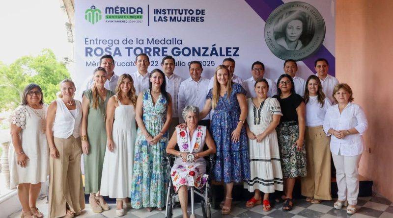 Mérida, Yucatán, 22 julio de 2025.- En reconocimiento a su lucha por los derechos de las mujeres desde el ámbito personal, profesional y en el servicio público, la presidenta municipal de Mérida Cecilia Patrón Laviada entregó la medalla ‘Rosa Torre González” a la Mtra. Bertha Elena Munguía Gil, a quien también agradeció su compromiso inquebrantable con la justicia social y la equidad de género.