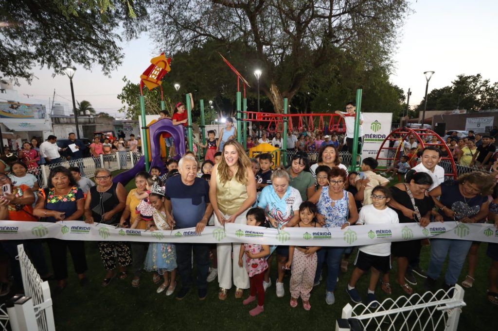 Durante una visita al parque de San Antonio Kaua, la edil encabezó la entrega de los trabajos de rehabilitación integral del espacio, que incluyeron la renovación del área infantil, instalación de ejercitadores, mobiliario urbano, andadores accesibles y luminarias LED, con el objetivo de fortalecer la seguridad y el uso comunitario del lugar.