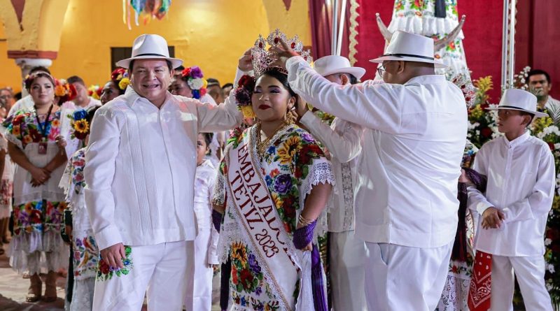 En ese lugar, el mandatario realizó la coronación de la embajadora entrante de la Feria Tradicional de Tetiz 2025, Vianey Guadalupe Cuytún, y asistió al mismo acto para las embajadoras de la tercera edad, Candelaria Balam, y infantil, Jade Ávila.
