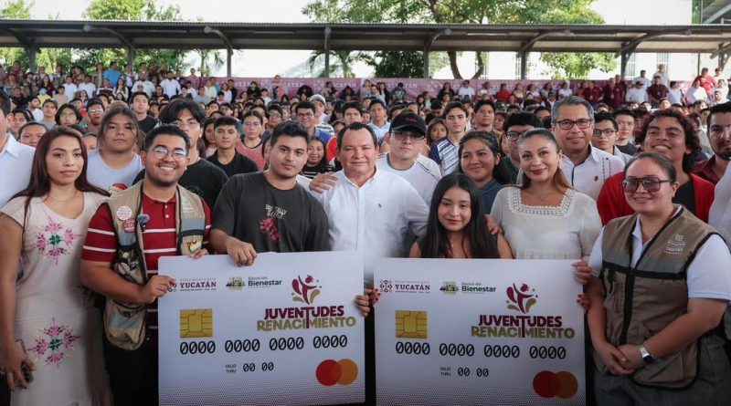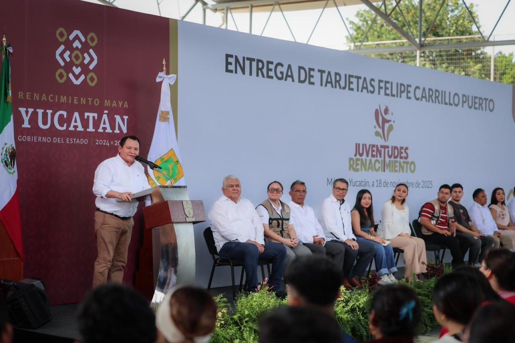 Mérida, Yucatán, a 18 de noviembre de 2025.- El Gobierno de Yucatán inició este martes la entrega de las tarjetas “Felipe Carrillo Puerto”, con las que 9,175 estudiantes de universidades públicas de Mérida recibirán un apoyo de tres mil pesos bimestrales para continuar sus estudios. El arranque se realizó en la Universidad Autónoma de Yucatán (UADY), encabezado por el gobernador Joaquín Díaz Mena.