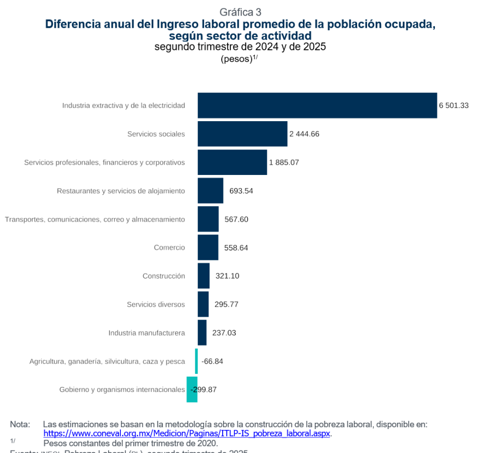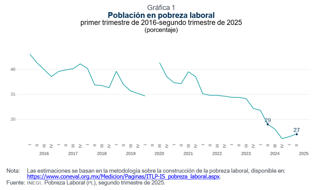 El organismo reportó que, entre el segundo trimestre de 2024 y el mismo periodo de 2025, la pobreza laboral disminuyó dos puntos porcentuales, al pasar de 29.0% a 27.0%.