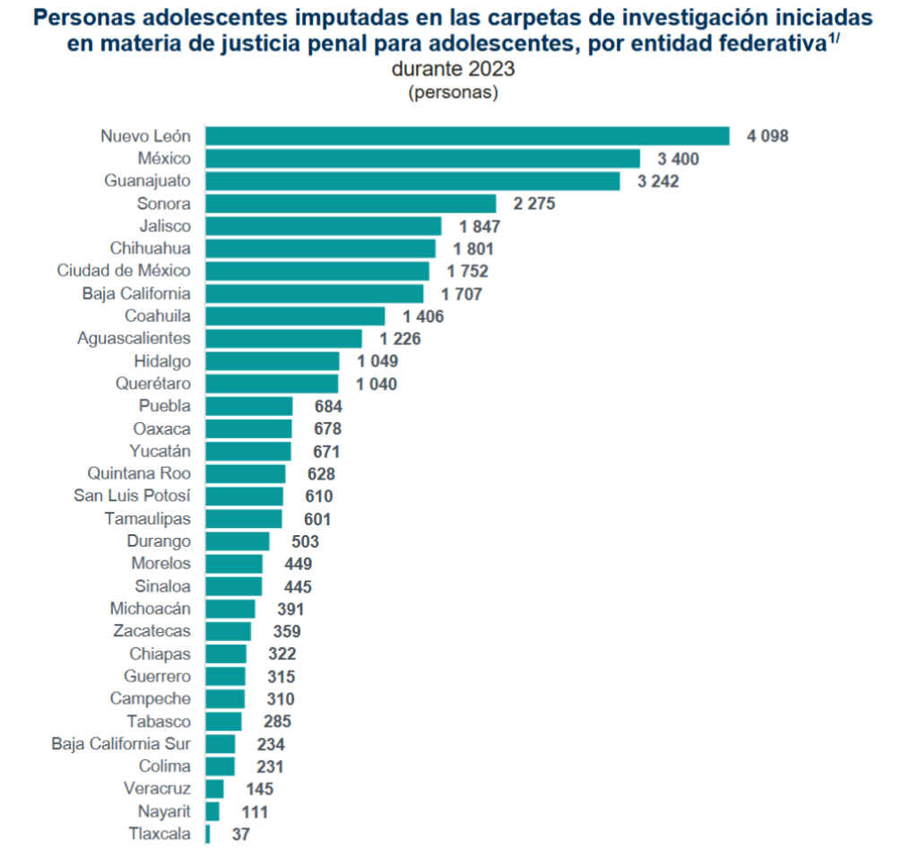 En ese año fueron las 6 entidades federativas concentraron 50.7 % de las 32 mil 852 personas adolescentes registradas como imputadas en carpetas de investigación en materia de justicia penal para adolescentes: Nuevo León, estado de México, Guanajuato, Sonora, Jalisco y Chihuahua.