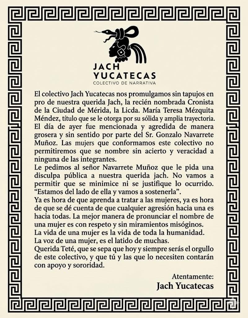 El colectivo Jach Yucatecas calificó como misóginas y ofensivas las expresiones difundidas por Gonzalo Navarrete Muñoz en redes sociales hacia la recién nombrada cronista y reiteró su respaldo a María Teresa Mézquita Méndez.