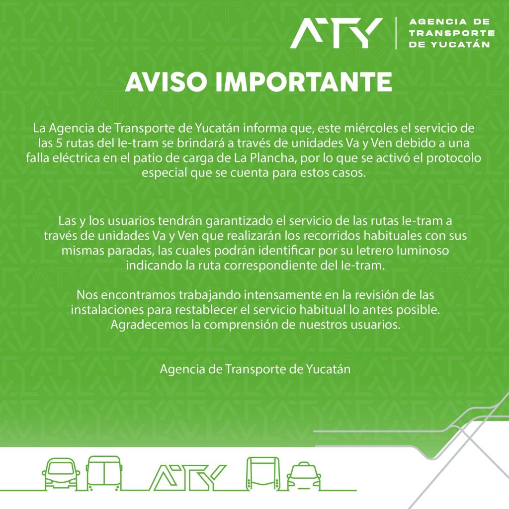 Sin embargo, la ATY garantizó que el servicio se prestará con unidades del Va y Ven que tendrán las mismas rutas y paradas y se identificarán con el letrero luminoso respectivo “Ietram”.