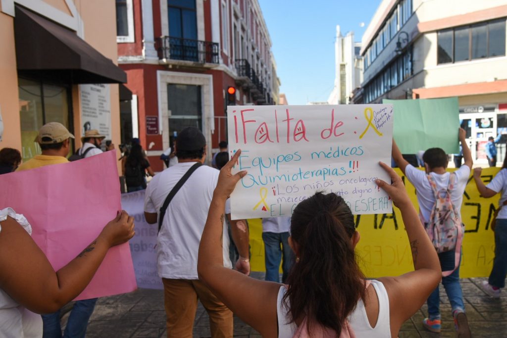 Madres y padres marchan en Mérida ante la falta de medicamentos oncológicos para las infancias y malas condiciones de infraestructura del hospital O’Horán.