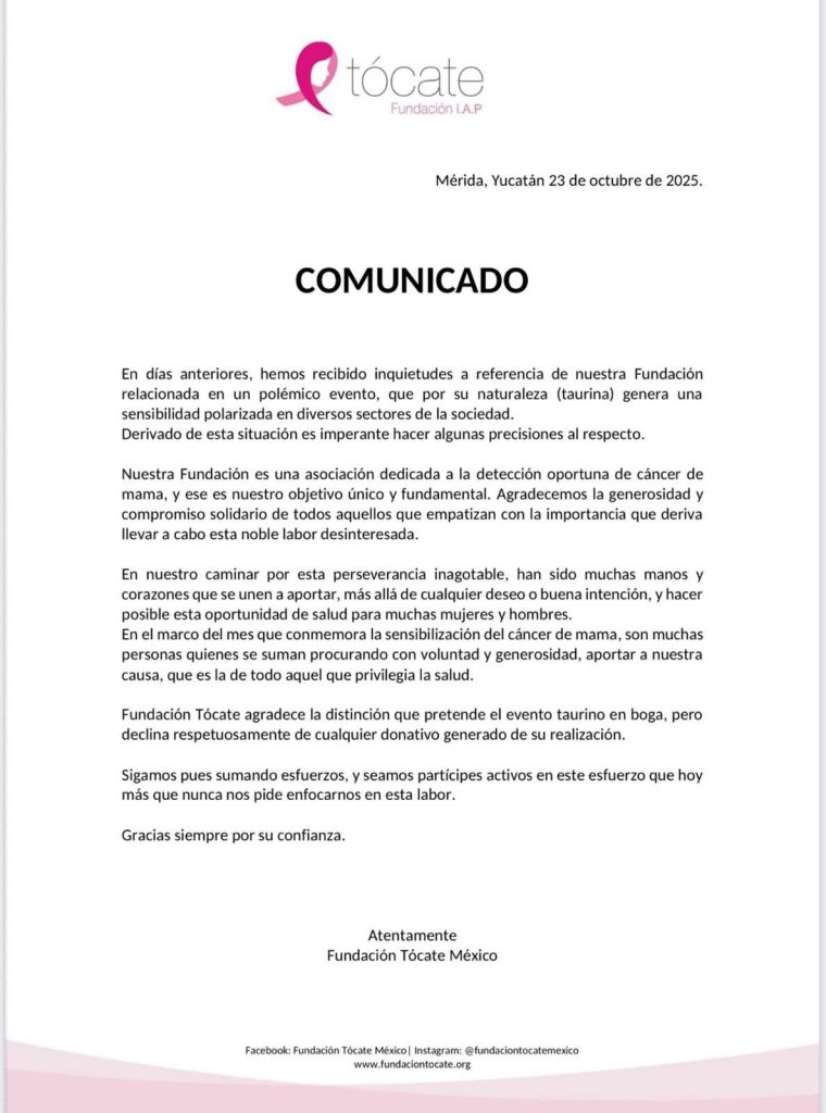 Mérida, Yucatán, a 24 de octubre de 2025.- La Fundación Tócate, dedicada a la detección temprana del cáncer de mama en Yucatán, anunció que no aceptará el donativo derivado de la corrida de toros que se realizará este 25 de octubre, con motivo de la reapertura de la Plaza de Toros de Mérida.