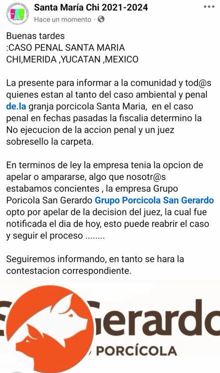 Mérida, Yucatán, a 10 de noviembre de 2025.- La disputa por la defensa del territorio y los derechos humanos en Santa María Chi no da tregua. El Grupo Porcícola San Gerardo presentó una apelación contra la decisión del Juzgado que sobreseyó el caso contra el comisario Wilberth Nahuat, lo que podría reabrir un proceso penal que la comunidad consideraba cerrado.