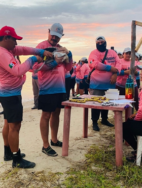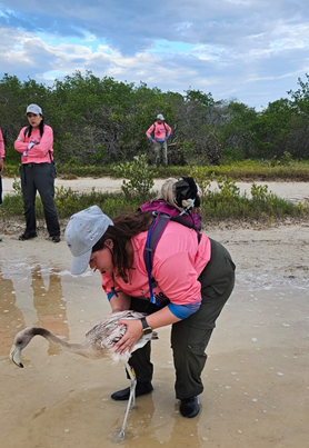 Por primera vez en la historia de esta labor, un grupo de mujeres se integró al arreo de flamencos. Estuvo conformado por Estefanía Munguía, del Miami Zoo; guardaparques de la Conanp; así como Alexandra Dzib, Ared Pereyra, Arleti Pérez y Margarita Canul.