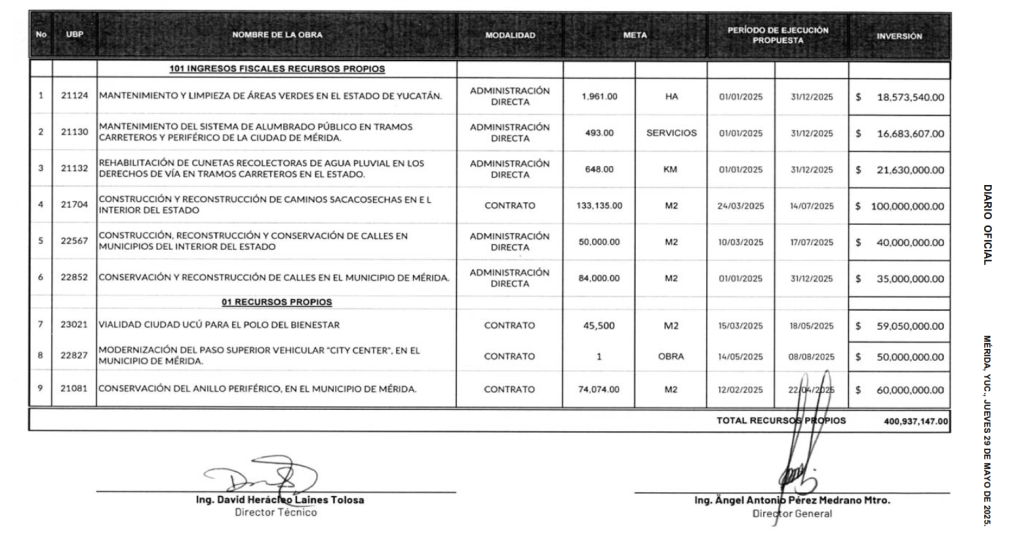 Para este 2025, de acuerdo con la publicación del Diario Oficial de Yucatán, el INCAY ejercerán un total de 400 millones 937 mil 147 pesos para un total de 9 proyectos. La mayor cantidad de este monto se destinará a la construcción y restauración de caminos saca cosechas en municipios del interior del estado.