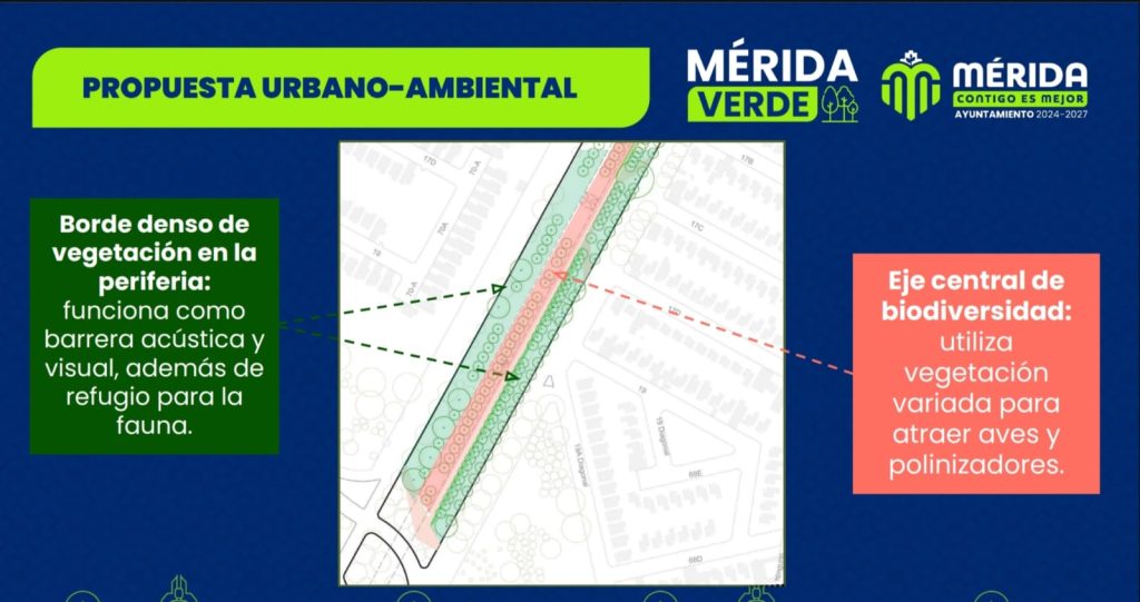 “No es un parque, es un corredor para proteger la flora y la fauna, para promover la recuperación ambiental, con una vegetación densa, árboles grandes en periferias que funcionen como una barrera acústica y visual, además de refugio para la fauna. En la parte central de biodiversidad se utilizará vegetación variada para atraer aves y polinizadores”, expuso.
