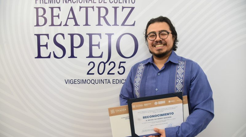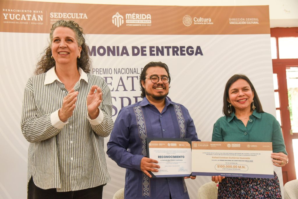 Mérida, Yucatán, a 14 de enero de 2026.- Para Rafael Esteban Gutiérrez Quezada, la cuarta fue la vencida. Tras participar varias veces en el certamen, esta ocasión lo encontró en la cima: fue elegido ganador del Premio Nacional de Cuento Beatriz Espejo 2025. Hoy recibió de manos de las autoridades culturales de Mérida y de Yucatán su reconocimiento y un cheque por 100 mil pesos.