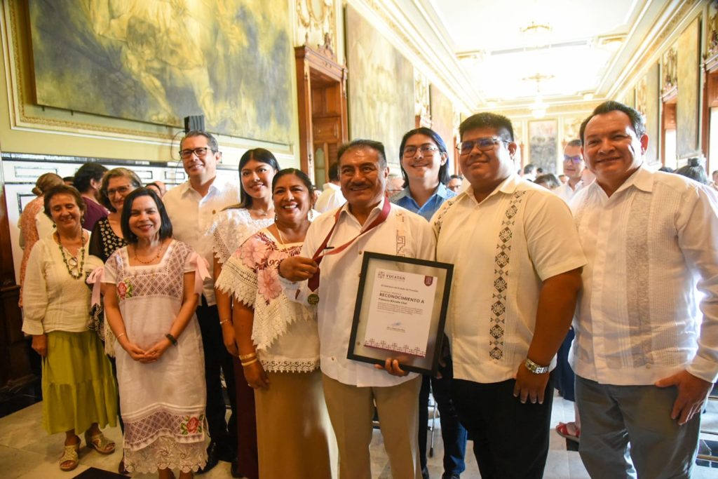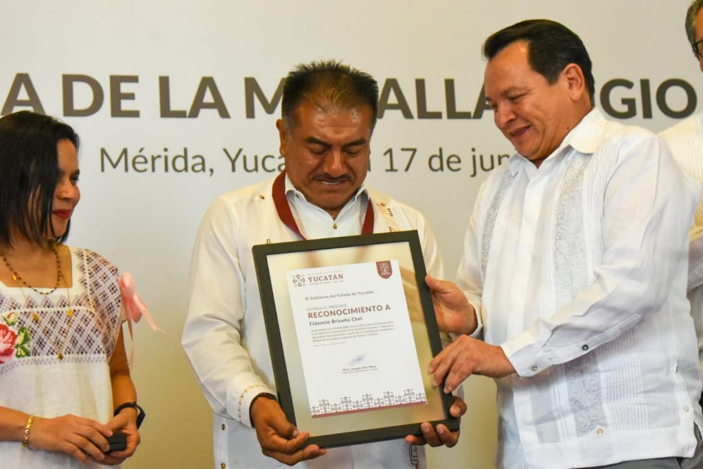 Fue el gobernador Joaquín Díaz Mena quien puso la medalla en el cuello del recipiendario y entregó el reconocimiento respectivo, en una ceremonia que se llevó a cabo en maya y en español, dando así un homenaje “a una figura que ha dejado huella profunda en la vida cultural y científica del estado”.