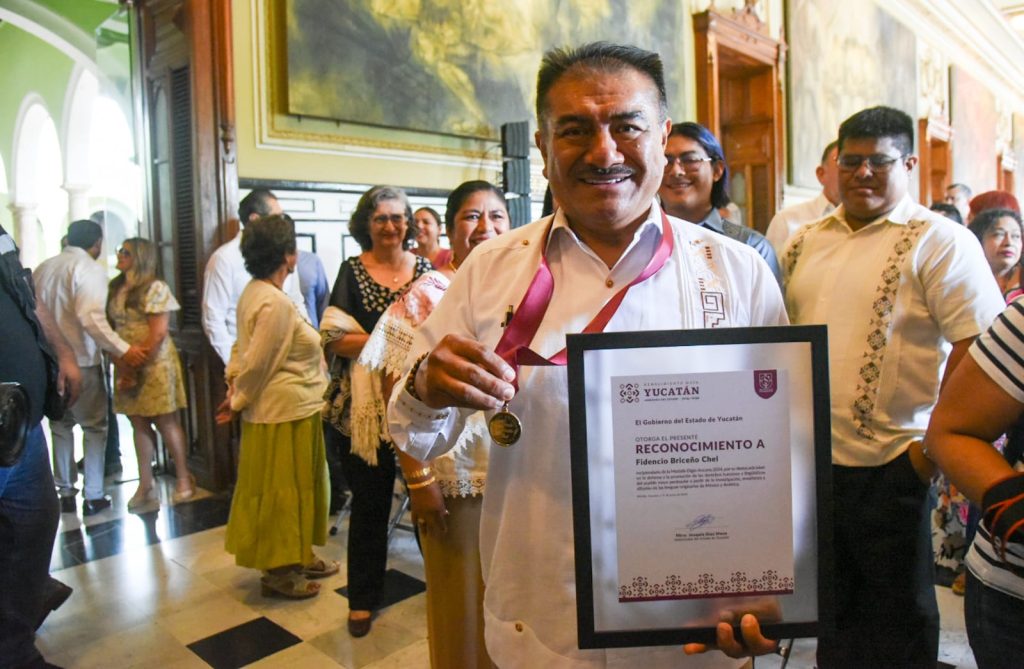 El doctor Fidencio Briceño Chel recibió hoy la Medalla Eligio Ancona de manos del gobernador Joaquín Díaz Mena. El antropólogo y lingüista maya recibió el reconocimiento “en memoria de las mujeres y hombres mayas que han defendido nuestra mayanidad, como quienes lucharon durante la guerra de castas, guerra social maya o gran batalla, pues en su centenario se instituyó este premio en 1947”.