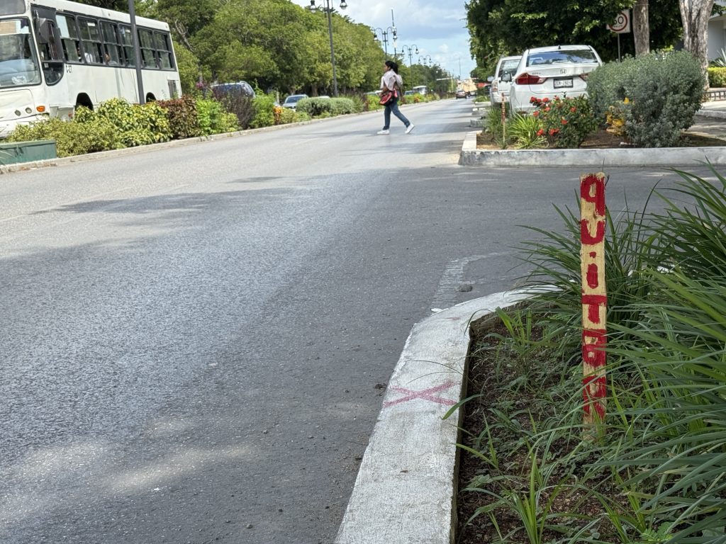 Mérida, Yucatán, a 31 de octubre de 2025.- Las jardineras de Paseo de Montejo volvieron al centro del debate público. Este jueves, varios arriates —también conocidos como islas peatonales— amanecieron marcados con cruces y estacas con las palabras “quitar” y “eliminar”, lo que abrió nuevamente la discusión sobre su futuro en la emblemática avenida meridana y generó dudas sobre si el retiro de esta infraestructura ya se encuentra en marcha.