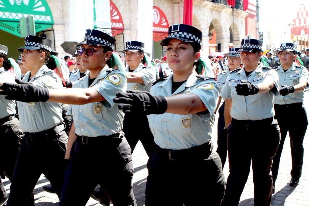 El desfile incluyó a la Policía Estatal, el Ejército Mexicano y la Policía Federal, que presentaron vehículos automotores y eléctricos, camiones de bomberos, binomios caninos, cuatrimotos, motocicletas, ambulancias, escoltas y bandas de guerra.
