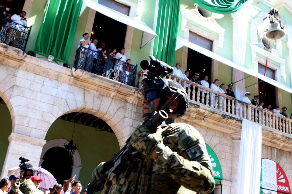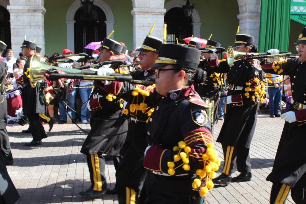 El gobernador Joaquín Díaz Mena encabezó el desfile en el que más de 4,900 elementos de escuelas, corporaciones de seguridad y Fuerzas Armadas marcharon por el Centro Histórico de Mérida.