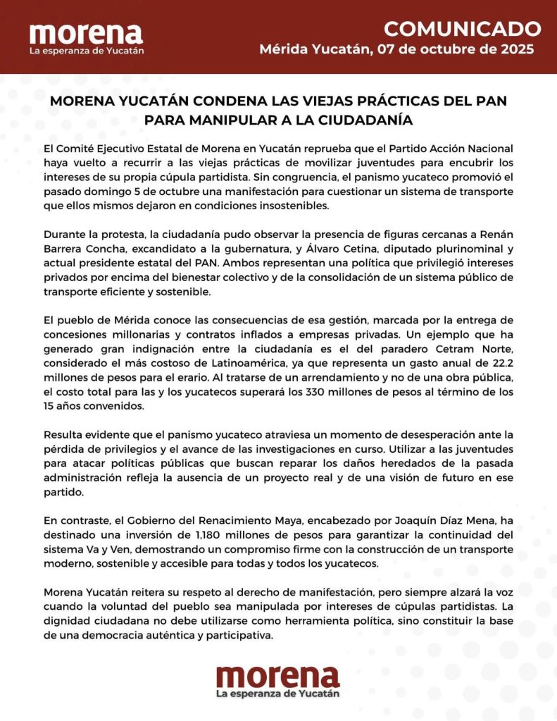 Mérida, Yucatán, 8 de octubre de 2025 — Para Morena Yucatán, las protestas ciudadanas del pasado 5 de octubre contra las fallas del transporte público no fueron más que un intento del PAN por “mover a sus juventudes” y encubrir los intereses de su dirigencia. Así lo aseguró el Comité Ejecutivo Estatal del partido guinda en un comunicado, donde prácticamente desestima el descontento social y reduce la manifestación a una maniobra política.