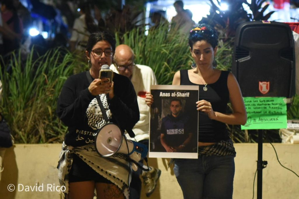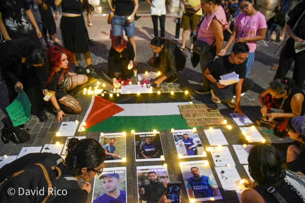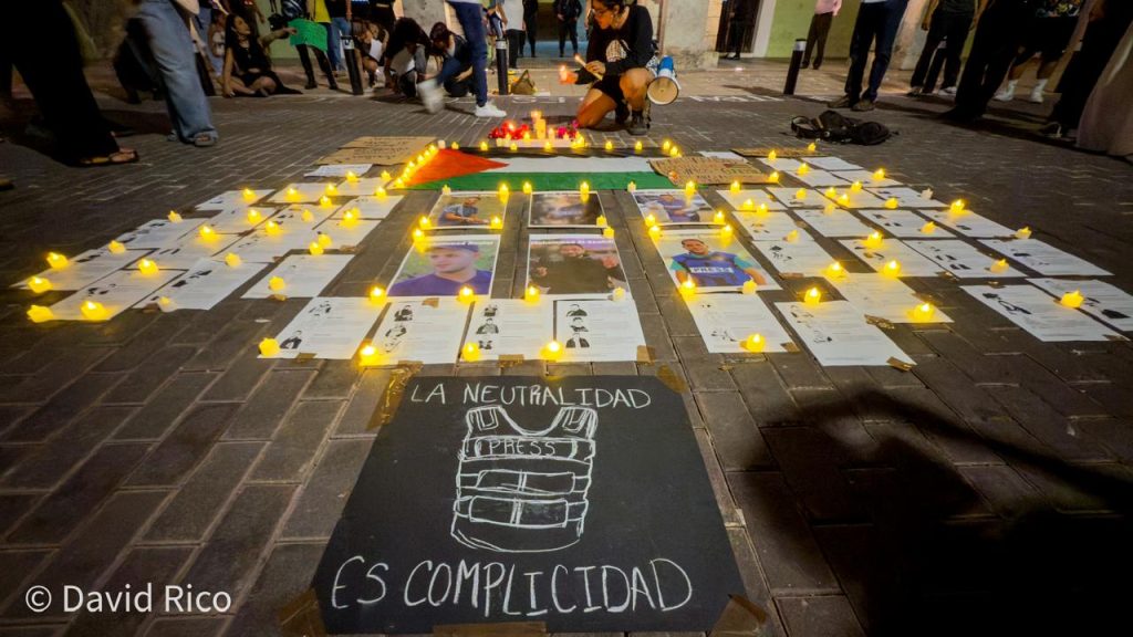 En el lugar se montó además un altar con veladoras y fotografías de los periodistas asesinados en Gaza, que sirvió como punto central del homenaje. Ahí se realizó un pase de lista de comunicadores caídos y se leyó el último mensaje de Anas al Sharif, reportero que murió junto con cinco colegas en la Franja de Gaza.