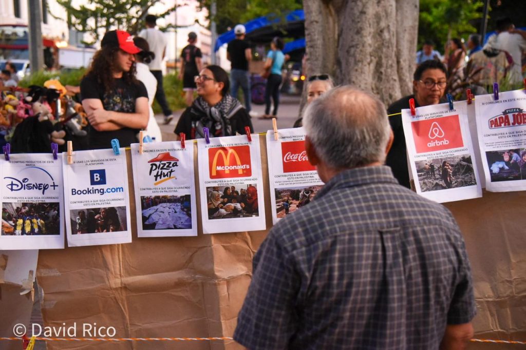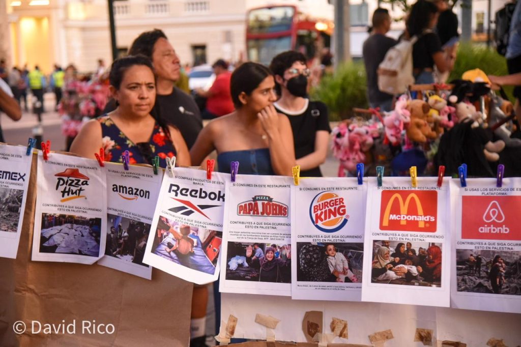 Durante la protesta también se denunció la complicidad de empresas internacionales que respaldan al gobierno de Israel, a las cuales señalaron de lucrar mientras se mantiene la violencia en Palestina. Como parte de la manifestación se colocaron carteles con los nombres y logotipos de estas compañías, a modo de denuncia pública.