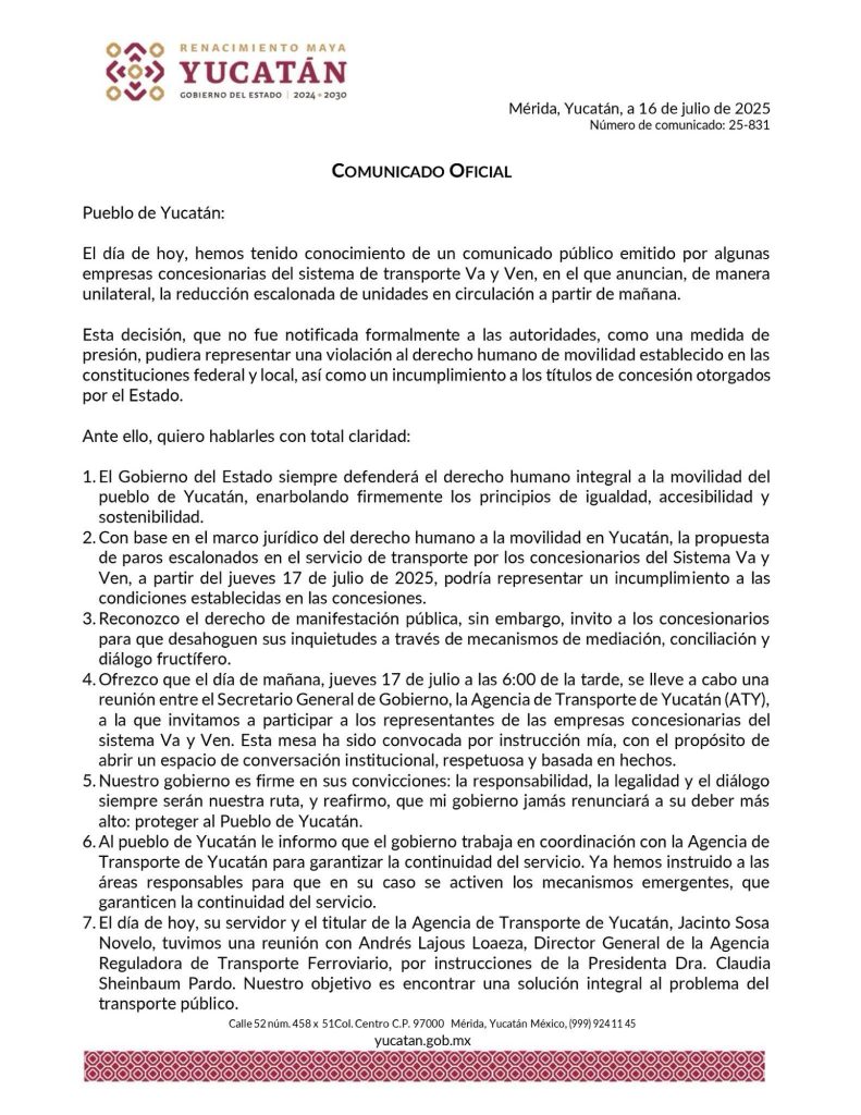 Mérida, Yucatán, 16 julio de 2025.- A través de un comunicado, el gobernador de Yucatán, Joaquín Díaz Mena, fijó su postura frente a la amenaza de paros escalonados del transporte púbico a partir de mañana, ante una presunta falta de pagos.