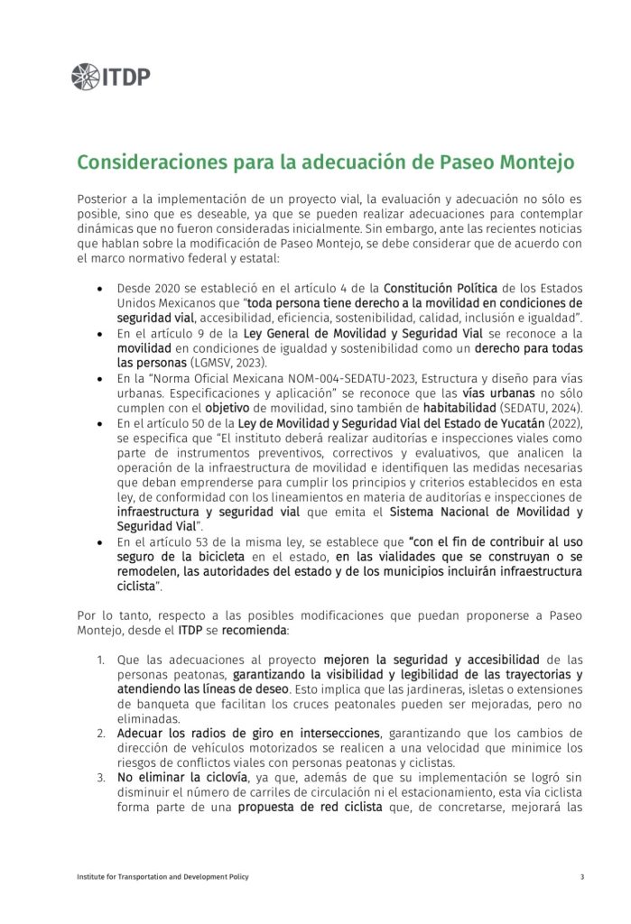 Ante la posibilidad de modificaciones en esta vialidad emblemática de Mérida, la organización especializada en movilidad urbana señaló que cualquier ajuste debe priorizar la seguridad vial, la accesibilidad y el fortalecimiento de la movilidad sostenible, en concordancia con la Ley General de Movilidad y Seguridad Vial y con la normativa estatal vigente.