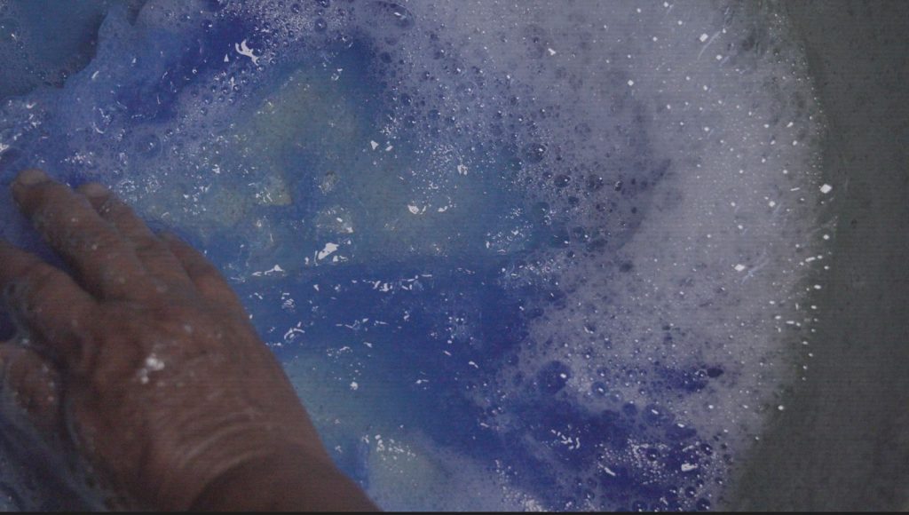 La música que converge a la perfección con la voz de Edgar, busca trasmitir la realidad natural del poema con su conexión al azul artificial del agua de lavado. El diseño de sonido también cuenta con elementos auditivos que nos transportan a ese momento en donde solo escuchamos la música creada a base de pájaros, ranas, grillos el cepillo y el agua correr de la batea.