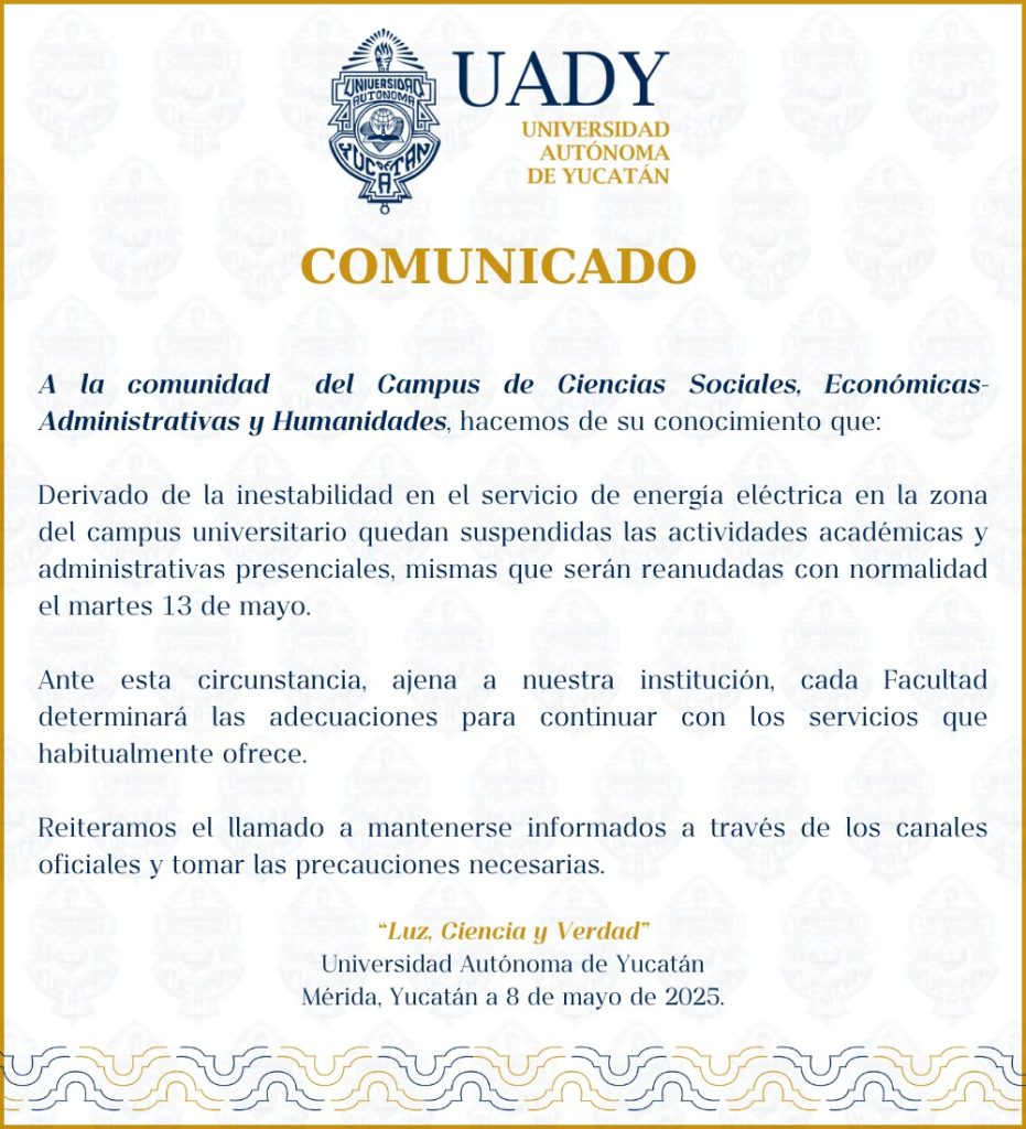 Debido a las fallas del suministro de energía eléctrica, la UADY anunció la suspensión de clases hasta el 13 de mayo en el Campus de Ciencias Sociales, Económicas-Administrativas y Humanidades.