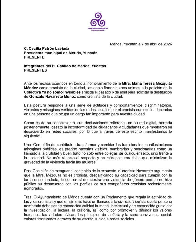 La solicitud fue firmada por representantes del Frente por los Derechos de las Mujeres en Yucatán, quienes pidieron a las autoridades municipales analizar el caso y emitir una resolución conforme a la normatividad vigente.