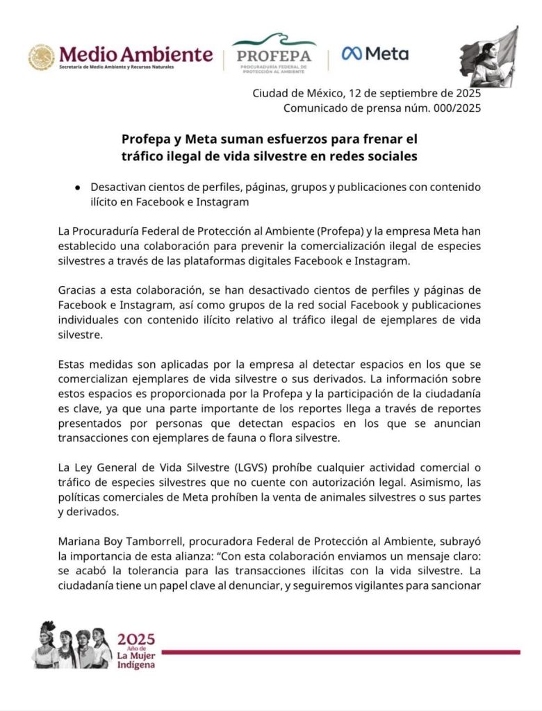 Mérida, Yucatán, 12 de septiembre de 2025.- La Procuraduría Federal de Protección al Ambiente (Profepa) informó en un comunicado de prensa que, en conjunto con la empresa Meta, estableció una colaboración para frenar la comercialización ilegal de especies silvestres a través de Facebook e Instagram.