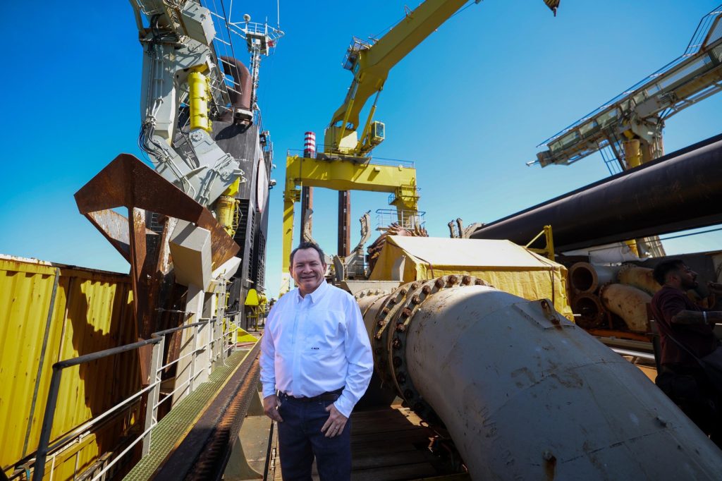 Durante la visita al buque de dragado Fernando de Magallanes, el gobernador Joaquín Díaz Mena observó las maniobras de extracción de material pétreo del fondo marino, como parte de los trabajos para ampliar y profundizar el canal de navegación del puerto.