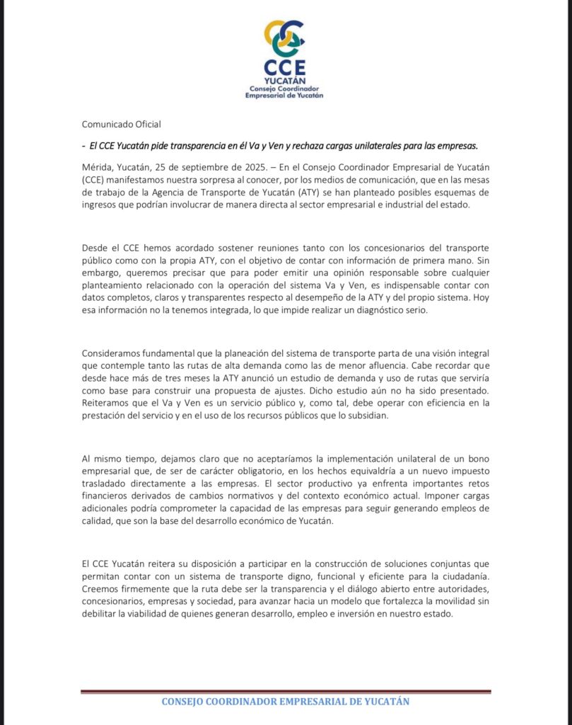 En un comunicado, el CCE señaló que “hemos acordado sostener reuniones tanto con los concesionarios del transporte público como con la propia ATY, con el objetivo de contar con información de primera mano. Sin embargo, queremos precisar que para poder emitir una opinión responsable sobre cualquier planteamiento relacionado con la operación del sistema Va y Ven, es indispensable contar con datos completos, claros y transparentes respecto al desempeño de la ATY y del propio sistema. Hoy esa información no la tenemos integrada, lo que impide realizar un diagnóstico serio”.
