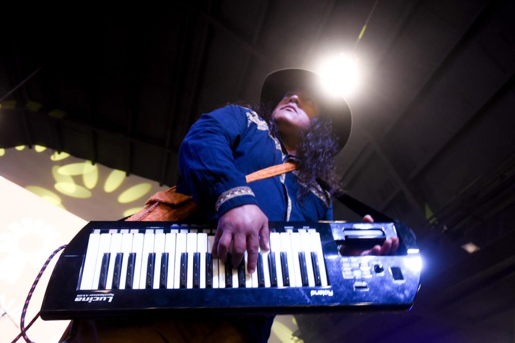 Y en medio de todo, un keytar frenético disparaba ráfagas de notas imposibles. El teclado colgado al pecho, como si fuera un arma sónica, lanzaba acordes delirantes, casi eléctricos, que trenzaban locura y ritmo sobre la base tribal de la banda. Su sonido, juguetón y vertiginoso, rompía el aire con destellos digitales, como si la electrónica se hubiera rendido ante la montaña Mixe.