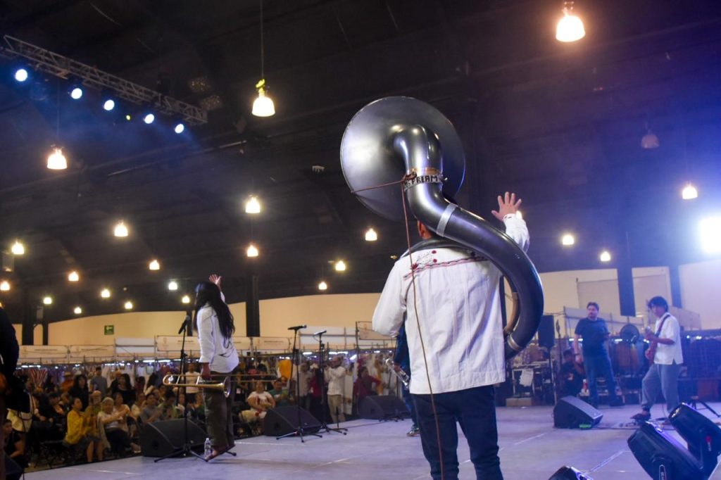 Apenas sonó la primera trompeta, el aire se estremeció. Los ritmos de Oaxaca retumbaron en las paredes, fundiéndose con destellos de jazz, funk, sonidos balcánicos, africanos y otros, en una mezcla tan rebelde como precisa. La tuba marcó un pulso profundo, casi telúrico; la batería golpeó con urgencia; la guitarra eléctrica lanzó relámpagos, y las trompetas y el trombón se elevaron como aves brillando entre la multitud.