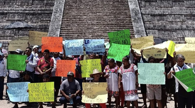 Prestadores de servicios y artesanos de Pisté protestan para seguir trabajando en la zona arqueológica y rechazar su traslado al nuevo centro de atención turística.