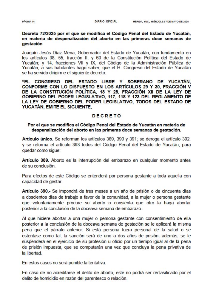 En los primeros minutos de este miércoles, casi un mes después que lo aprobó el Congreso estatal, se publicó en el Diario Oficial del Gobierno de Yucatán el Decreto 72/2025 que despenaliza el aborto hasta las 12 semanas de gestación en la entidad, con lo cual entrará en vigencia mañana 08 de mayo.