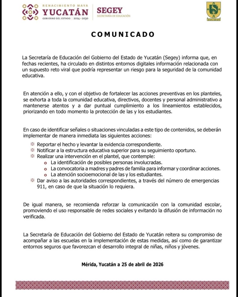 Mérida, Yucatán, a 25 de abril de 2026.- La Secretaría de Educación del Gobierno del Estado de Yucatán (Segey) informó que, en fechas recientes, ha circulado en distintos entornos digitales información relacionada con un supuesto reto viral que podría representar un riesgo para la seguridad de la comunidad educativa.