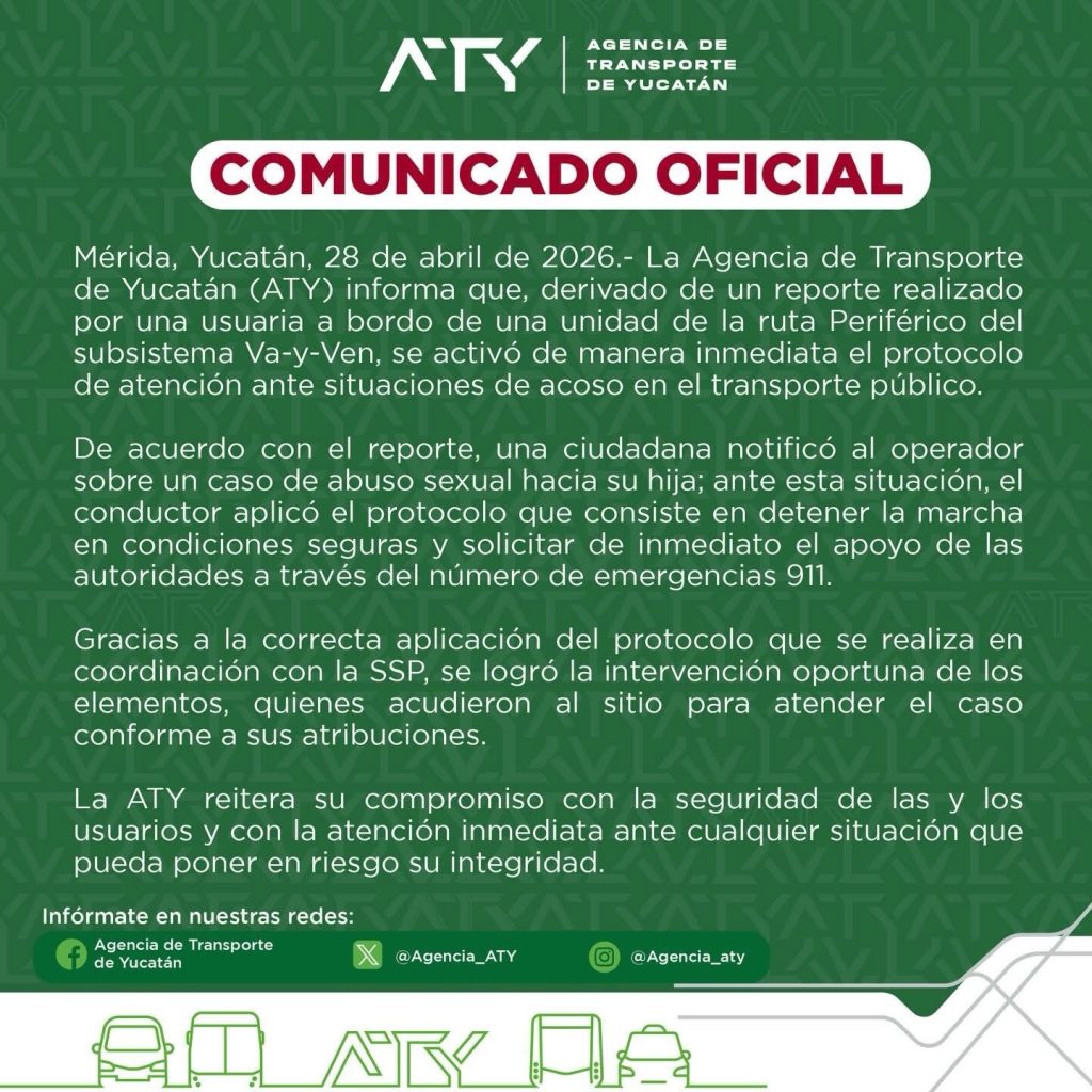 Mérida, Yucatán, 28 de abril de 2026.– La Agencia de Transporte de Yucatán confirmó la activación de su protocolo de atención ante acoso en el transporte público, tras un reporte de presunto abuso sexual contra una menor a bordo de una unidad de la ruta Periférico del sistema Va y Ven.