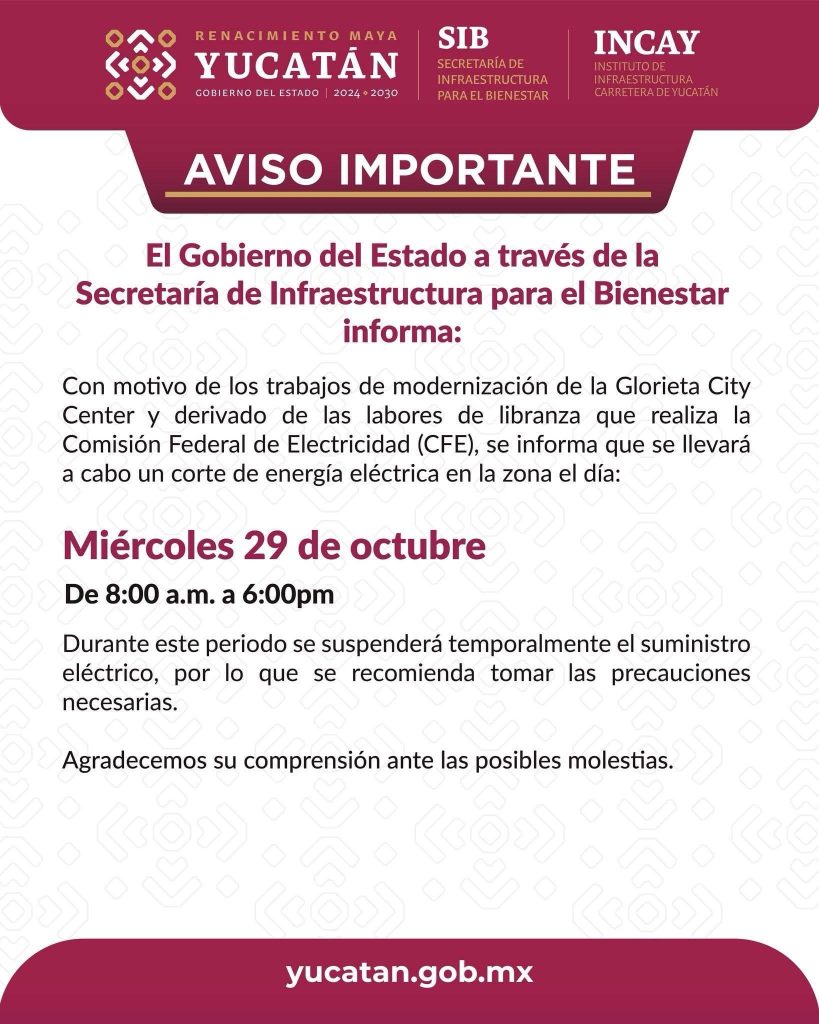 La Secretaría de Infraestructura para el Bienestar de Yucatán dio a conocer que la Comisión Federal de Electricidad (CFE) llevará a cabo labores de libranza eléctrica, indispensables para continuar con las obras en curso. Durante ese periodo, comercios, oficinas y viviendas ubicadas en los alrededores estarán sin suministro de energía.
