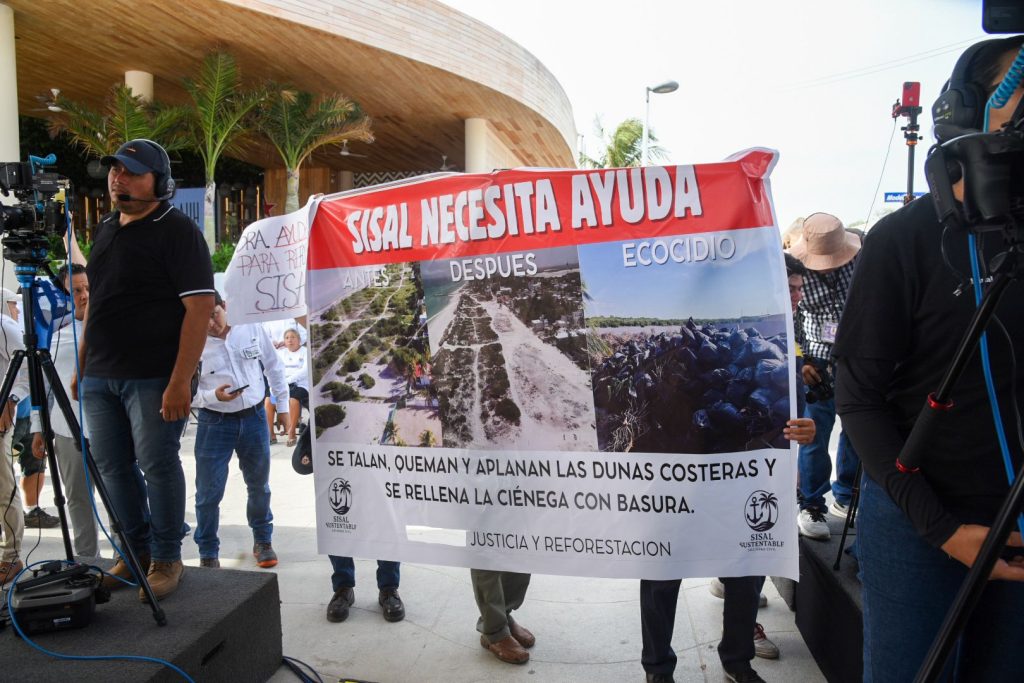 Al lugar llegaron pobladores de Sisal con una manta en la que se leía: “Sisal necesita ayuda. Se talan, queman y aplanan las dunas costeras. Se rellena la ciénega con basura” y celebraron el discurso del mandatario.