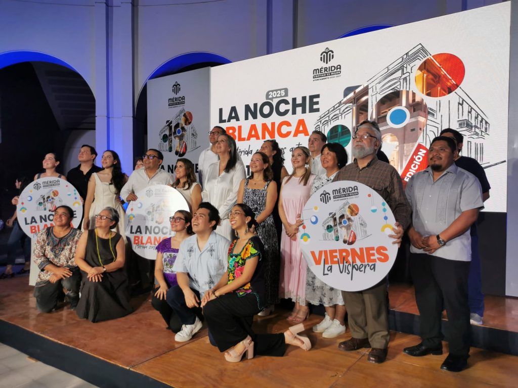 Mérida, Yucatán, 15 mayo de 2025.- Esta noche se presentó La Noche Blanca y su Víspera, que en esta edición 2025 tendrá exclusivamente talento local, con 816 artistas y 292 actividades, 302 expositores de bazares en 137 sedes y llegando a colonias my comisarías para garantizar el acceso a todas y todos a la cultura.