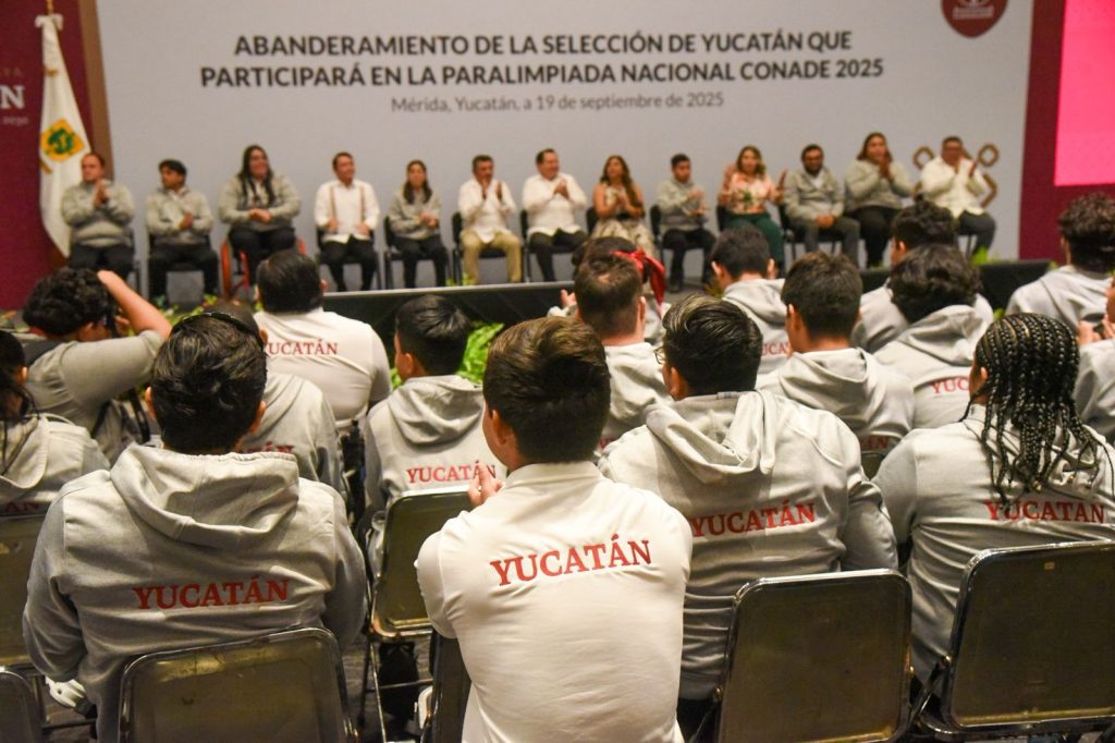 Mérida, Yucatán, 19 de septiembre de 2025.– El gobernador Joaquín Díaz Mena abanderó a la delegación de atletas paralímpicos que representarán a Yucatán en la Paralimpiada Nacional 2025, que se llevará a cabo en Aguascalientes del 21 de septiembre al 13 de octubre. El equipo parte con la meta de superar las 82 medallas obtenidas el año pasado.