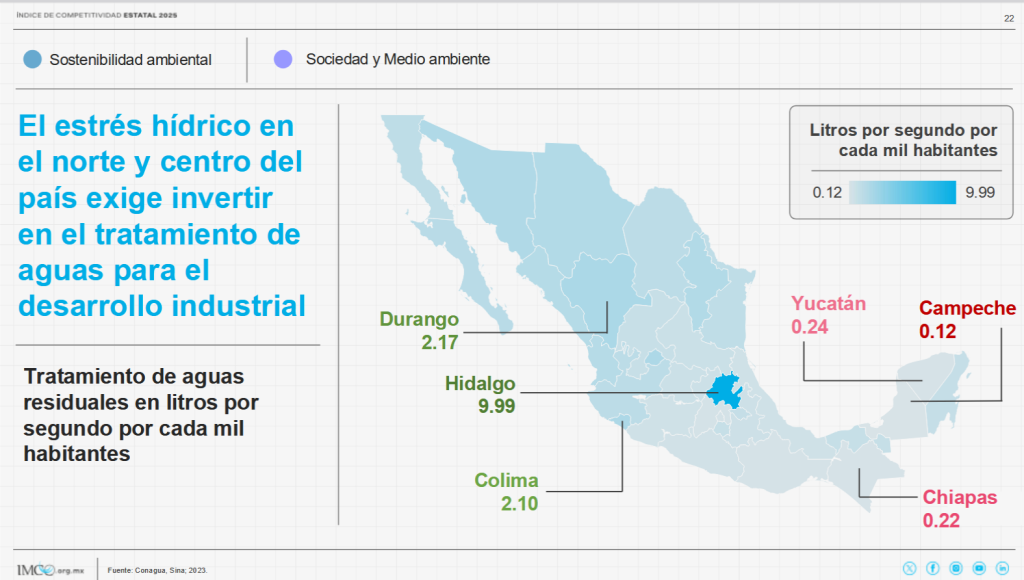 En comparativa, la entidad que tiene un mejor manejo de aguas residuales es Hidalgo ya que da tratamiento a 9.99 litros de aguas residuales por segundo por cada mil habitantes. Le siguen durango con 2.17 y Colima con 2.10.