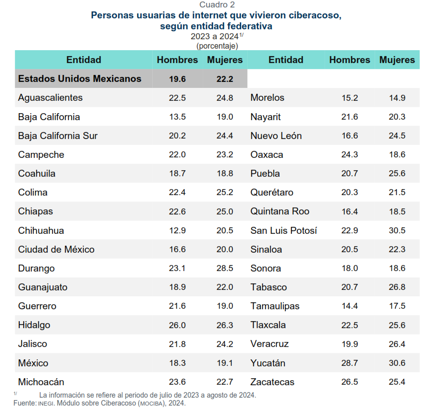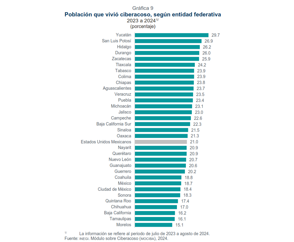 De acuerdo con los datos del Módulo sobre Ciberacoso (MOCIBA) 2024 del Instituto Nacional de Estadística y Geografía (INEGI) la mayor prevalencia de ciberacoso se registró en Yucatán, con 29.7 por ciento.